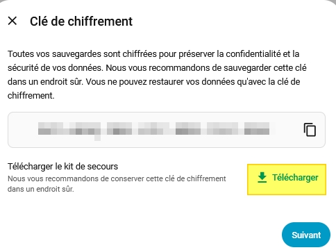 Une clé de chiffrement est automatiquement générée, celle-ci est à sauvegarder: