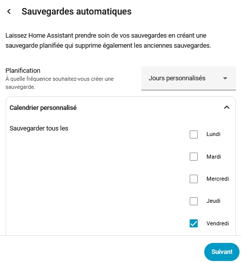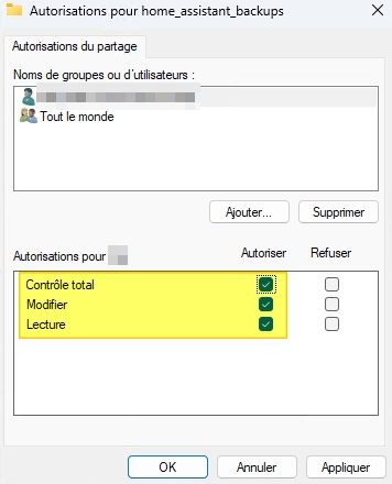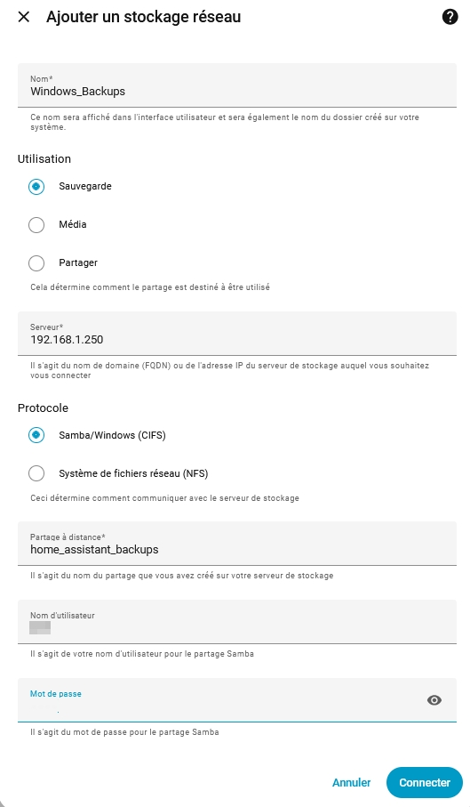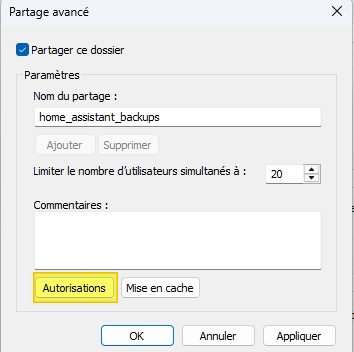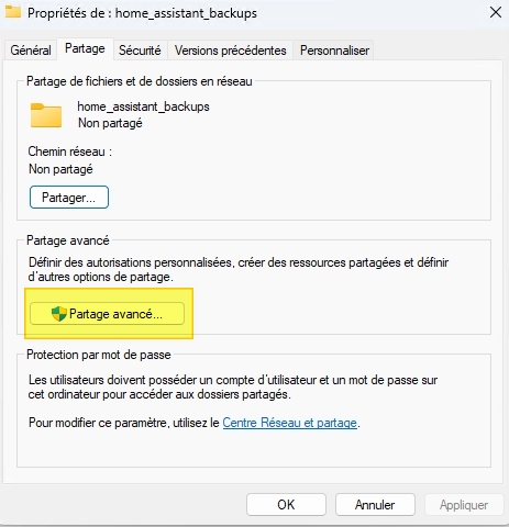 Afin d'externaliser les sauvegarde de Home Assistant OS, on va passer par un partage de dossier (samba), on configure un Partage avancée...: