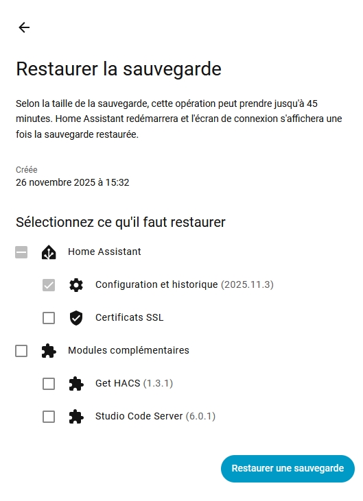 Une fois le .tar uploadé Home Assistant me propose les élément sà restaurer:
