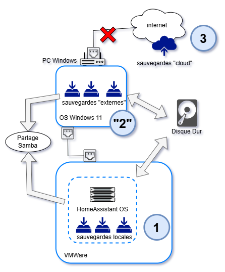 Dans cette configuration, l'utilisation d'un disque dur partagé ne permet pas de respecter la règle de sauvegarde '3-2-1', car le support n'est pas considéré comme 'différent' (les copies sont au même endroit).